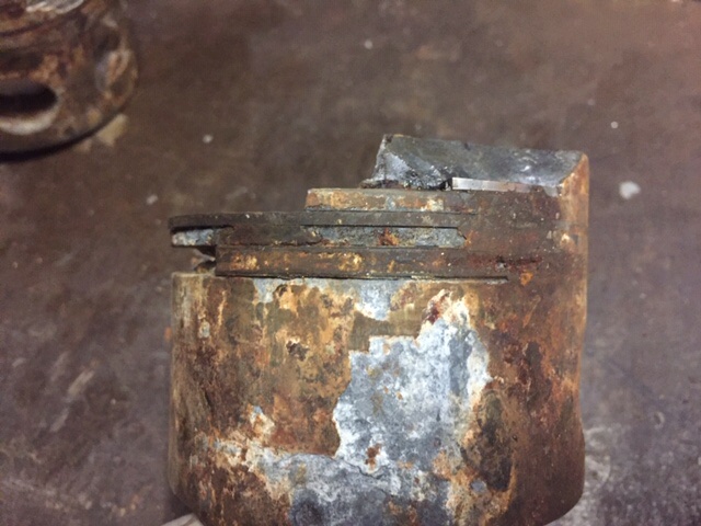 Here is a picture of the piston after I had to drill it from the liner. You can see the level of corrosion. The liner was no better.