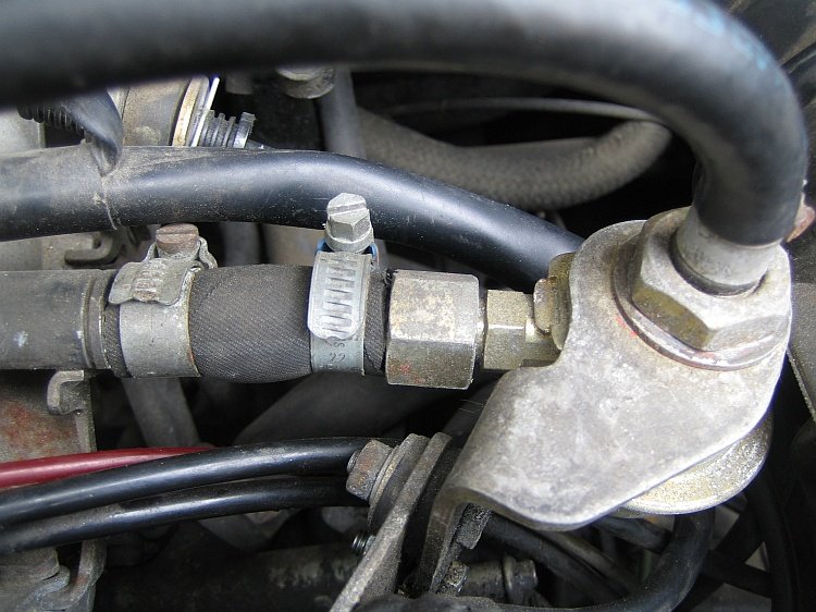 Das ist an sich normal, allerdings ist der kurze Schlauch mal eneuert worden, der wird im Alter gerne brüchig. Original ist der fest am Rohr angepresst und am Regler mit einer Ohrenschelle befestigt, wenn ich mich richtig erinnere. Der oben angeschlossene Rücklaufschlauch ist ja auch nicht mehr original.