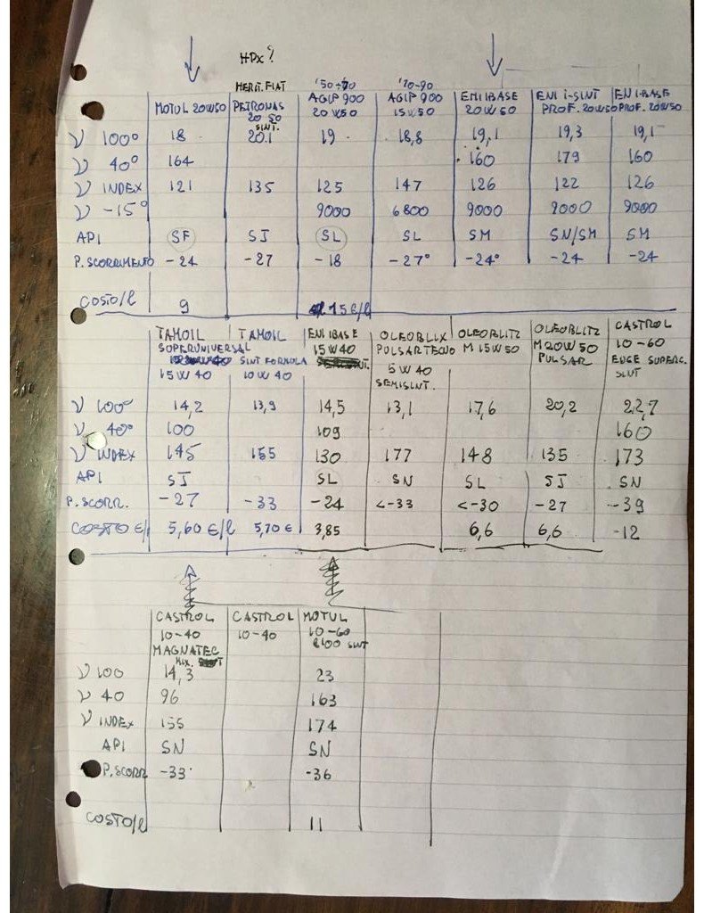Sulla mia GT 3C in passato usai ENI I BASE 15/40, poi un meccanico mise MOTUL 20W50 (gran consumo). Recentemente allora ho fatto una ricerca sul web delle varie caratteristiche degli oli dichiarate cercando un olio che avesse buona viscosità ed un buon indice, buona classificazione API, reperibilità on line, costo contenuto, eventualmente semisintetico (Allego mia tabella con le caratteristiche rilevate).