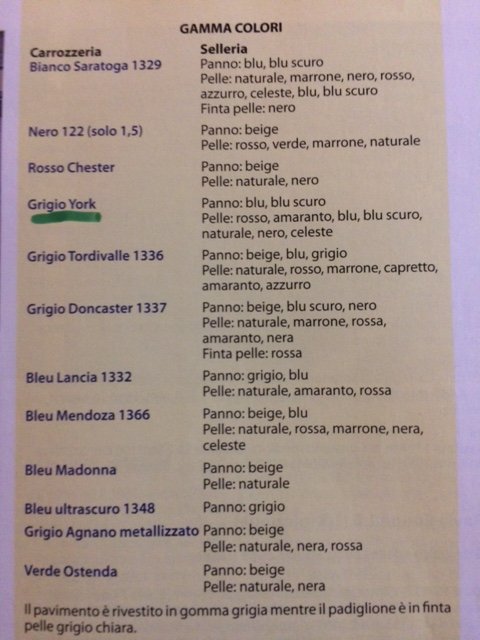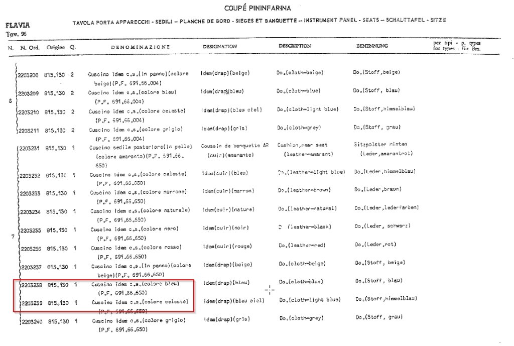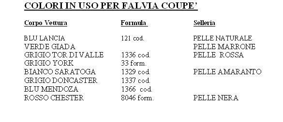 Purtroppo gli specchi di finizione della Flavia coupé non sono più disponibili, per cui ci si deve arrangiare, allego inoltre una scarna tabella del Lancia Club con alcuni abbinamenti vernice - pelle, il documento è osceno ma gli abbinamenti sono giusti. E' comunque noto che la Pininfarina (e anche la stessa Lancia), su ordinazione, realizzasse anche abinamenti non previsti ma queste cose, in assenza di documentazione, sono sempre difficili da dimostrare.