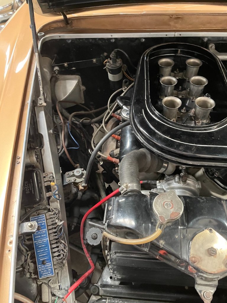 There is something strange, specialists will be able to identify. Looking at the carburetors, the engine is a 3C probably 2.8, consistent with type 826.138. I thought that the Flaminia Touring 2.8 had the bonnet opening in the direction from the back to the front of the car, so with the hinges on the cooling radiator side!!!! On your photos we see the hinges at the foot of the windshield.