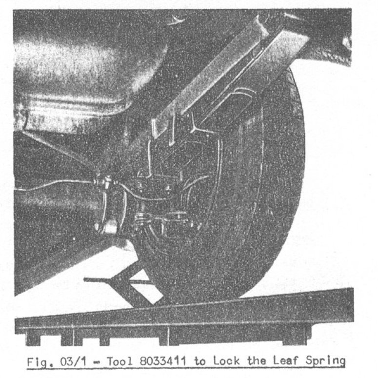 Ci-joint une photo claire du manuel d'atelier, une photo du catalogue des outils spéciaux et le croquis 10651 contenant la distance à respecter pour serrer les boulons et la distance à charge statique. Une alternative simple pourrait être de charger le coffre avec des poids afin d'obtenir le bon dégagement.