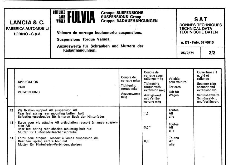 Pour Fulvia, les données techniques que j'ai , (version 1971 , DT fulv. 07/0020) , indiquent les hauteurs entre tampon de butée et bras supérieur. Les deux valeurs indiquées sont 60 à 70mm "voiture à vide" et 15à 25 sous charge statique.