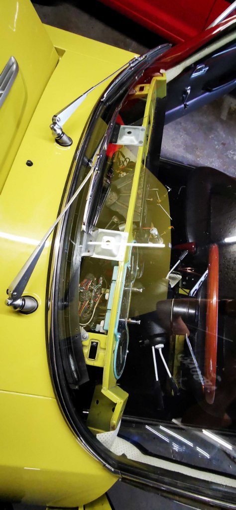 Die „Holz“-Verkleidung lies sich erst entfernen nachdem die obere „Lippe“ des Armaturenbrettes entfernt wurde. Diese ist mit 4 schrauben befestigt: 2 ganz aussen und 2 jeweils unter der Frontscheibe. Danach konnte ich die Holz-Platte entfernen. Das sah dann so aus.