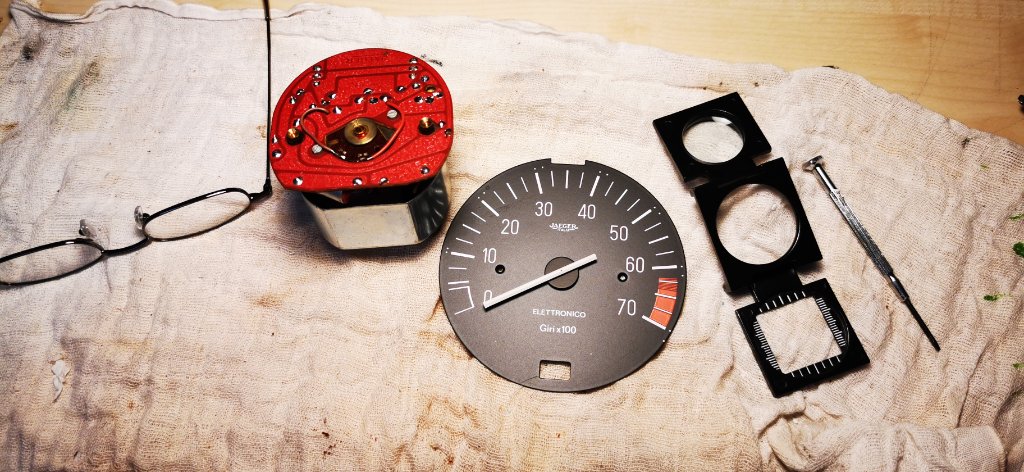 Beim Drehzahlmesser war die 1. Herausforderung, das Plexiglas bruchfrei vom Kombi-Instrument zu entfernen, vor allem weil meines schon Risse aufweisst. Nach viel Gefriemel und Geduld konnte ich es aber entfernen und den Drehzahlmesser ausbauen.