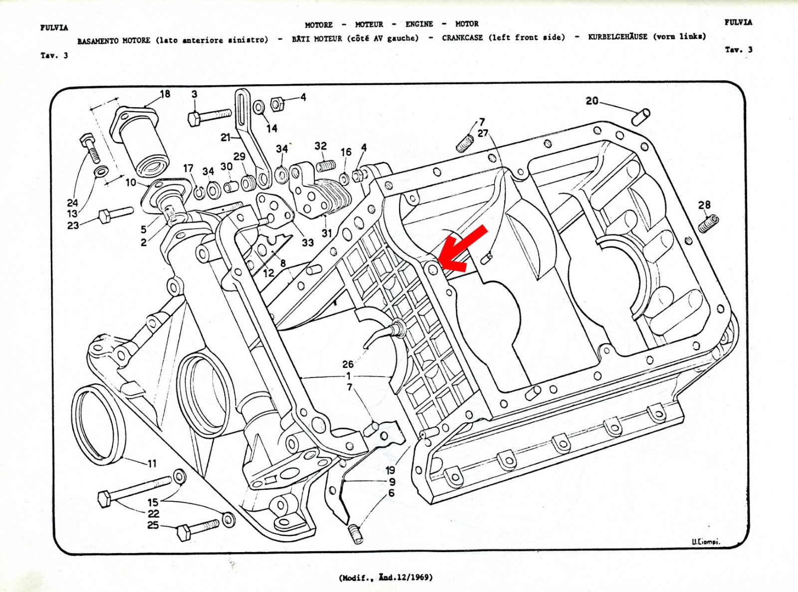 It sits where the red arrow points. It is all the way down in the cylinder block. Not really hidden but if I ever forget to take out a bolt, this would be the most likely candidate.
