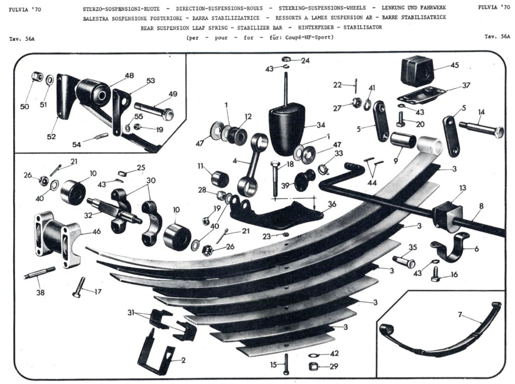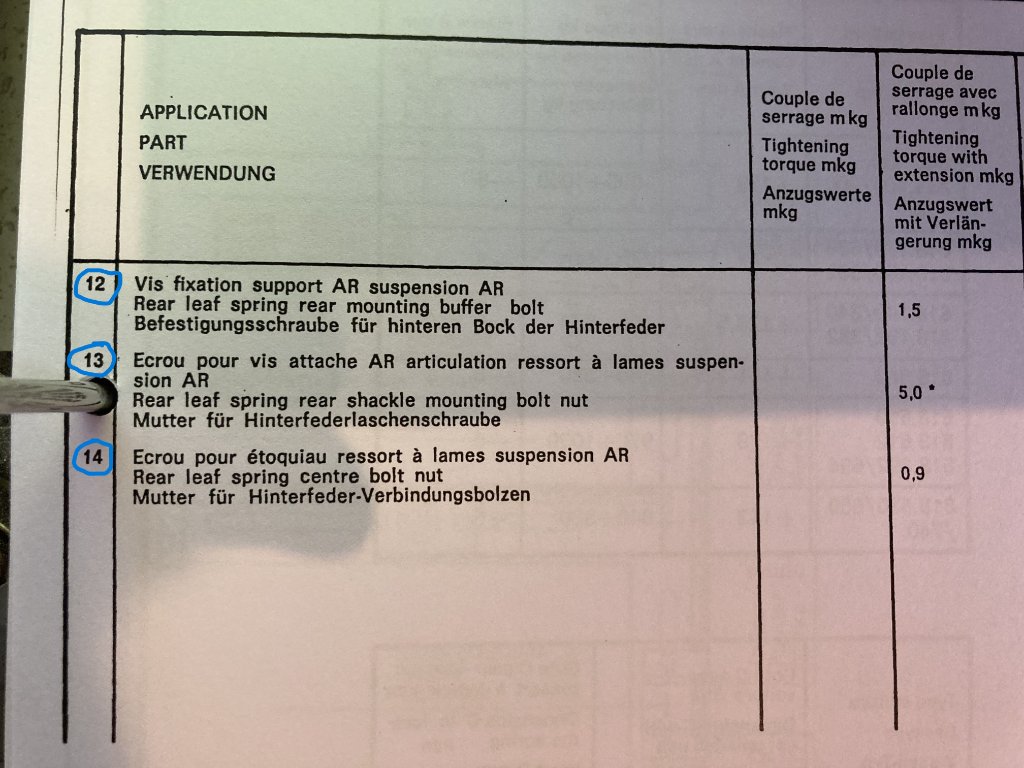 Denk je? Zou kunnen hoor. Het blad uit het boek is van 25 februari 1971. Het rare is dan dat de bevestiging met een groot silent bloc voor toen nog niet bestond. Lancia gebruikt wel 4.0 mkg voor M10 8.8 bouten. Dus die 4.0 mkg is ook goed voor de bouten die de as aan de veer bevestigen. Daarvoor gebruik je sleutel 17. Voor de moeren TAV56A#26 gebruik je ook sleutel 17.