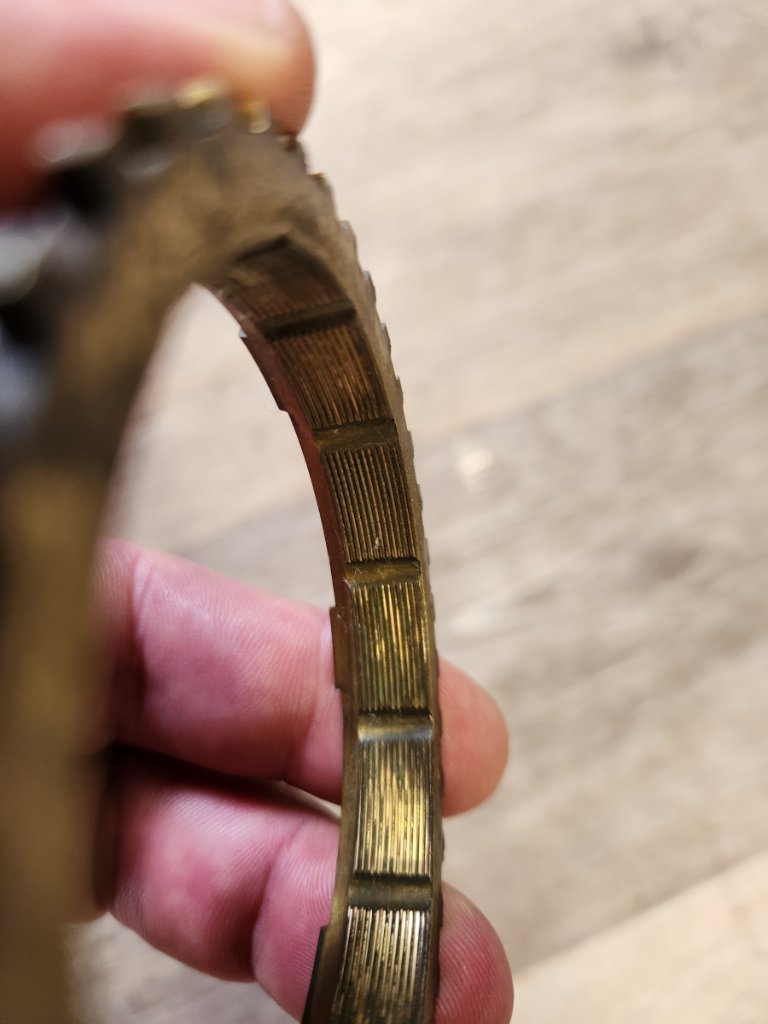 Best of all, my second gear downsift issue is fixed! Have been nursing that for 10 years... The syncro was basically brand new, but has clearly not been lapped when installed by a gearbox shop previously. From the shiny and dull marks in attached picture you can see the inside of the syncro ring did not fully make contact with the cone. After lapping with grinding paste for about 30 second the "grip" on the cone drastically increased. There is now no delay or grinding when shifting (down or up) into second, even when cold!