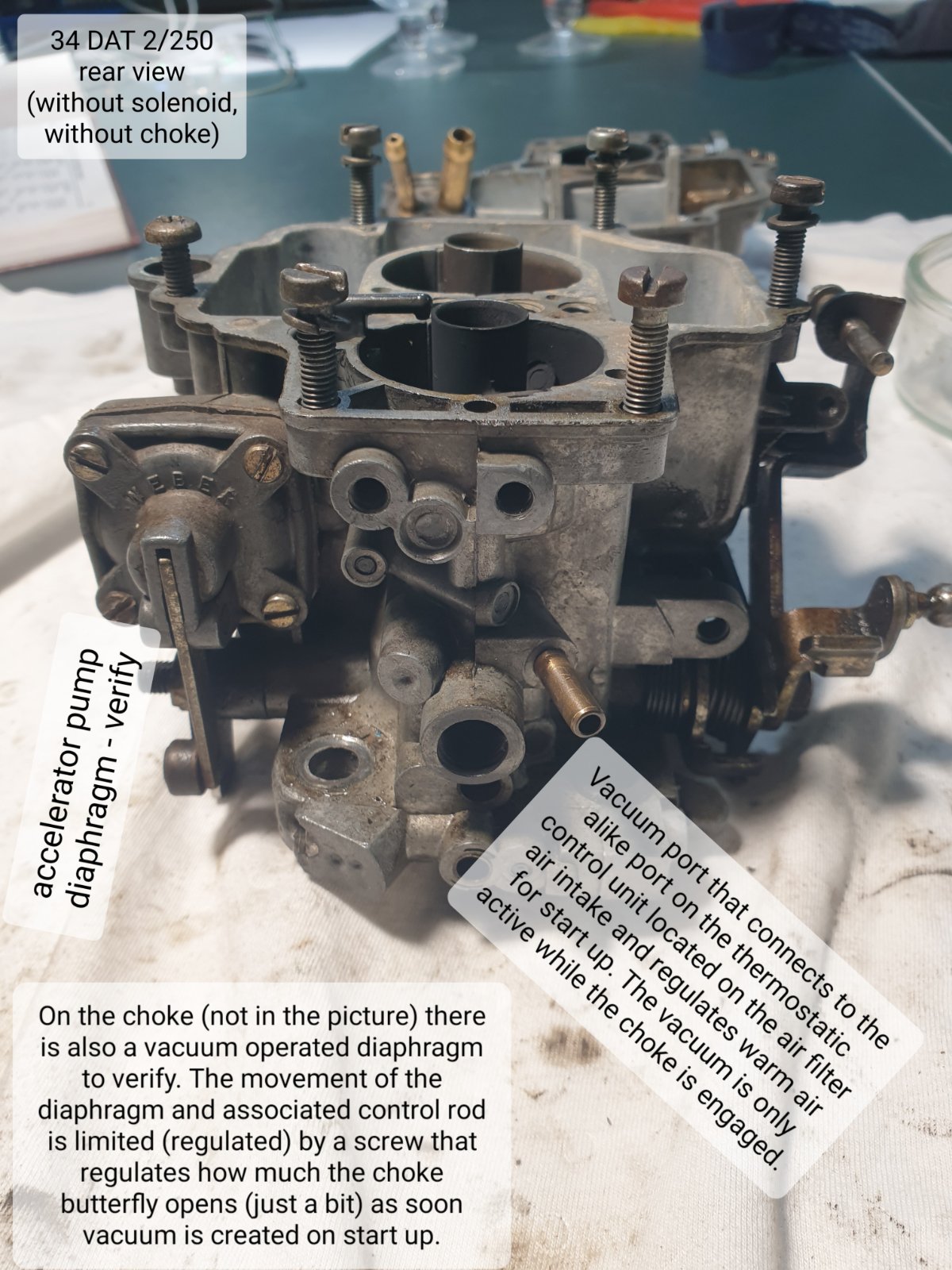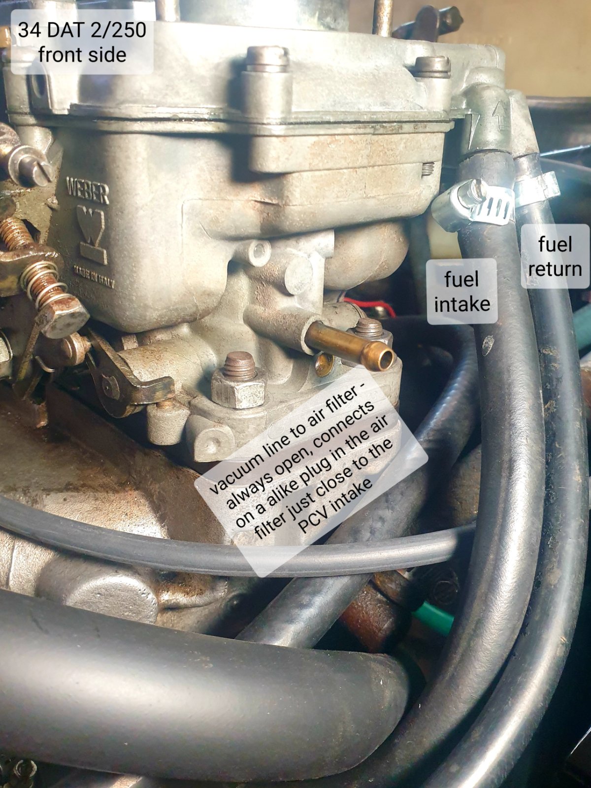 Reply to the previous post. No and yes. My 1981 Lancia Beta Coupé 2000 (from the Belgium market) comes with a Bosch electronic ignition system and the distributor has no vacuum advance capsule. Consistently the installed and original Weber 34 DAT 2/250 carburator has no "ported" vacuum to the distributor. And yes, in this specific carburator the rear port is a "ported" vacuum that could or should connect to one of the two small pipes on the bottom of the air filter assembly (see third picture), that are part of a red thermovalve marked "AC", for italian brand Auto Clima. And from there another connection should go to the thermostatic control unit. This is how it should be, no more no less, in my specific car with this specific carburator. It so happens that in my car the AC valve is not functioning anymore. So I decided to bypass it and i didn't explain this contingency in the picture but i do it now. Well, this is for my car, and sometimes I have more doubts than certainties. But one thing is sure. There are a lot of carburater variants and the devil is on the detail.