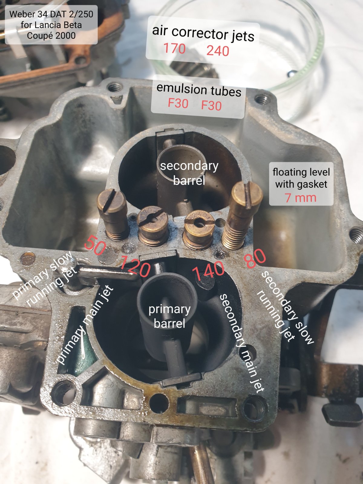 I have a 1981 Lancia Beta Coupé 2000, originally from Belgium, that comes with a Weber 34 DAT 2/250 carburator. I did a major overall to the carburator and everything seems to be working fine. Nevertheless I found out so little information about this model and i had so much trouble finding out what goes where that, to eventually facilitate others, I decided to provide the main aspects of this specific model in a few pictures. Sampaio