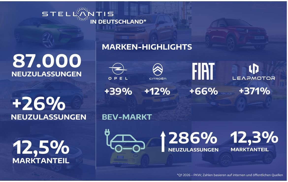 Rüsselsheim, 7. April 2026 – Starkes erstes Quartal für Stellantis in Deutschland: Von Januar bis März haben die Marken der Gruppe sowohl bei den Neuzulassungen als auch beim Marktanteil deutliche Gewinne erzielt. Der Absatz von rein batterie-elektrischen Pkw hat sich gegenüber dem Auftaktquartal 2025 fast verdreifacht.