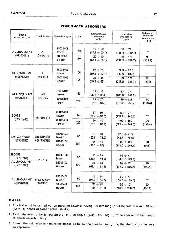 Ich weiß auf Anhieb nicht mehr woher, aber ich habe noch zwei Tabellen zu den von Dir angesprochenen Zug- und Druckstufen zu verschiedenen Fulvia Modellen und zeitgenössischen Dämpferherstellern ausgegraben. Ich erlaube mir diese als Ergänzung zu Deinen Ausführungen anzuhängen.
