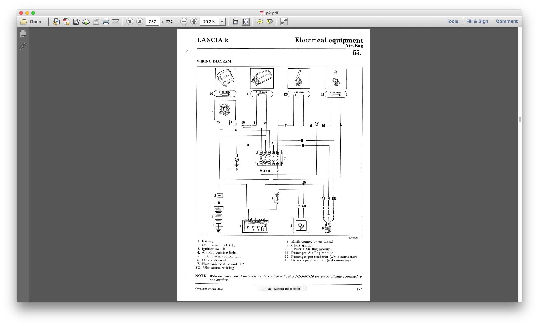 In het werkplaatshandboek (p4.pdf) is voor de post-98 kappa wel veel informatie te vinden over zijairbags, maar helaas niet zo'n plaatje met weerstandswaarden. Het schema is er wel (zie tweede bijlage, waarin nummer 517 en 518 de zijairbags zijn), en deze liet inderdaad 3 draden zijn voor de zijairbags; één van die drie is massa.