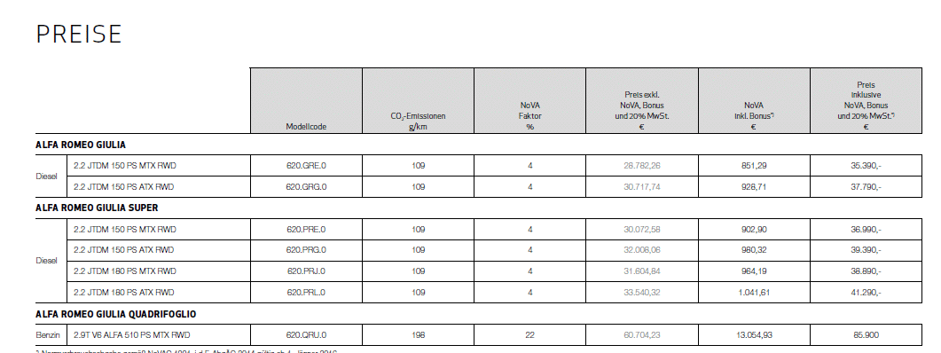 Alfa Romeo Giulia 2.2 Diesel 100 kW (136 PS) 33.100 Euro (ab ca. Mitte Juni)