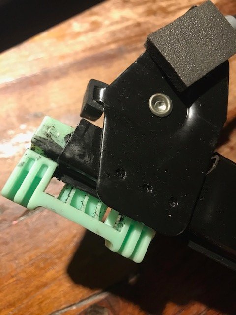 Ik zat mee eigenlijk af te vragen of voor het glijstift probleem niet een definitieve oplossing bedacht kan worden? Ik zit het systeem eens te bestuderen en probeer te achterhalen waar de zwakte zit. Ik heb nu een kapot systeem uit mei 2003 met een wit oud blokje. Het lusje brak net af toen ik 'm wilde buigen, dus het verbaast me niks dat het hele blokje het na verloop van tijd begeeft: het is hard stug plastic en droogt waarschijnlijk uit na verloop van tijd. Het valt me ook op dat de rails aan één kant een stop heeft met een rubber blokje, die de klap opvangt, maar de andere kant heeft dat niet. Zou daar een oplossing kunnen zitten: dus zorgen dat de glijstift niet zo dicht bij het uiteinde kan komen. Het blokje gaat daar half van de rails af: