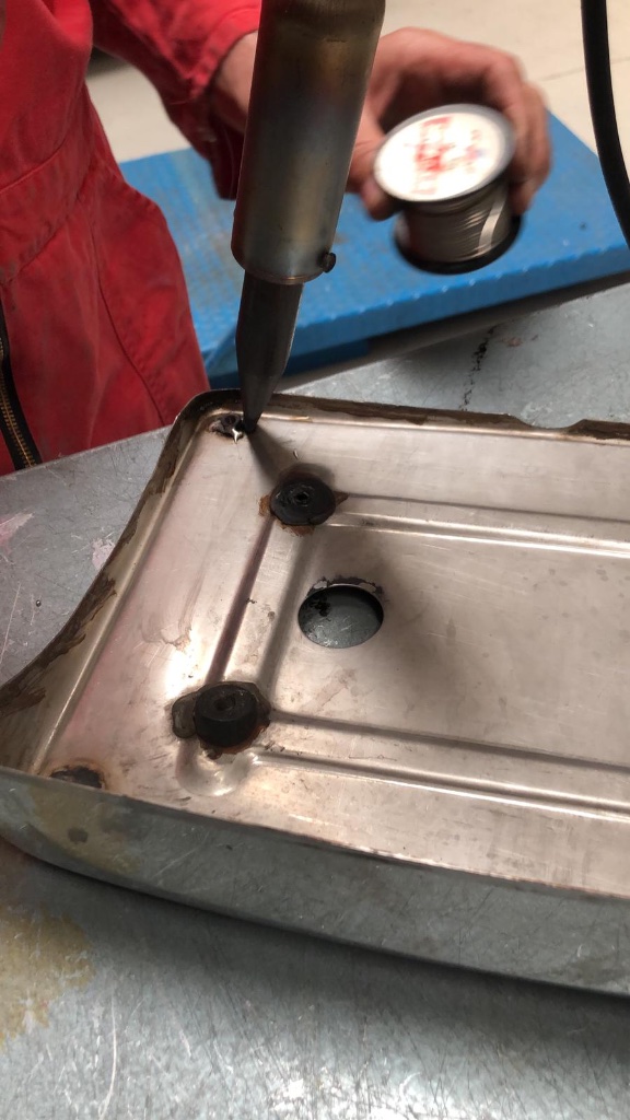 Secondo me è sufficiente dargli una carteggiata fine per togliere la ruggine e pulirlo bene, non credo che avrà grandi problemi all' interno del serbatoio