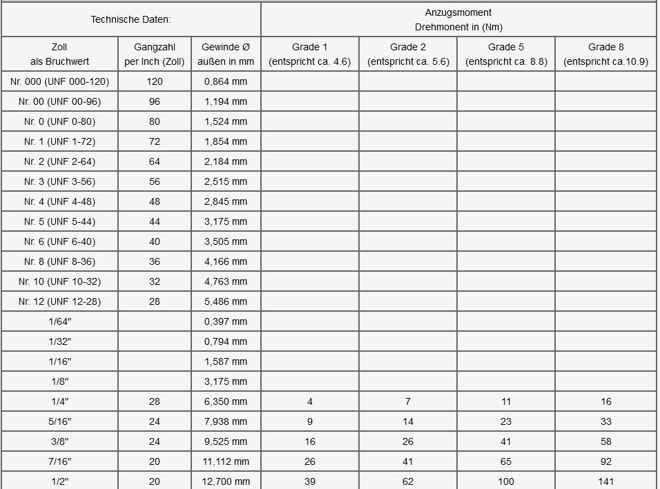 Ich habe festgestellt dass bei den UNF Schraubenlieferanten üblicherweise bei Festigkeitsklasse Grade 8 (=10.9) Schluss ist, daher findet man (ich) in den Listen im Netz auch keine Werte zu den Anzugsmomenten mit noch höherer Festigkeit...