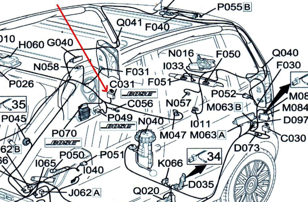 Verifica il punto di massa posteriore destro C031, ed indicato dalla freccia. ...IN PRATICA CORRISPONDE AL PUNTO DI MASSA PRESENTE REALMENTE SULLA SCOCCA DELL'AUTO