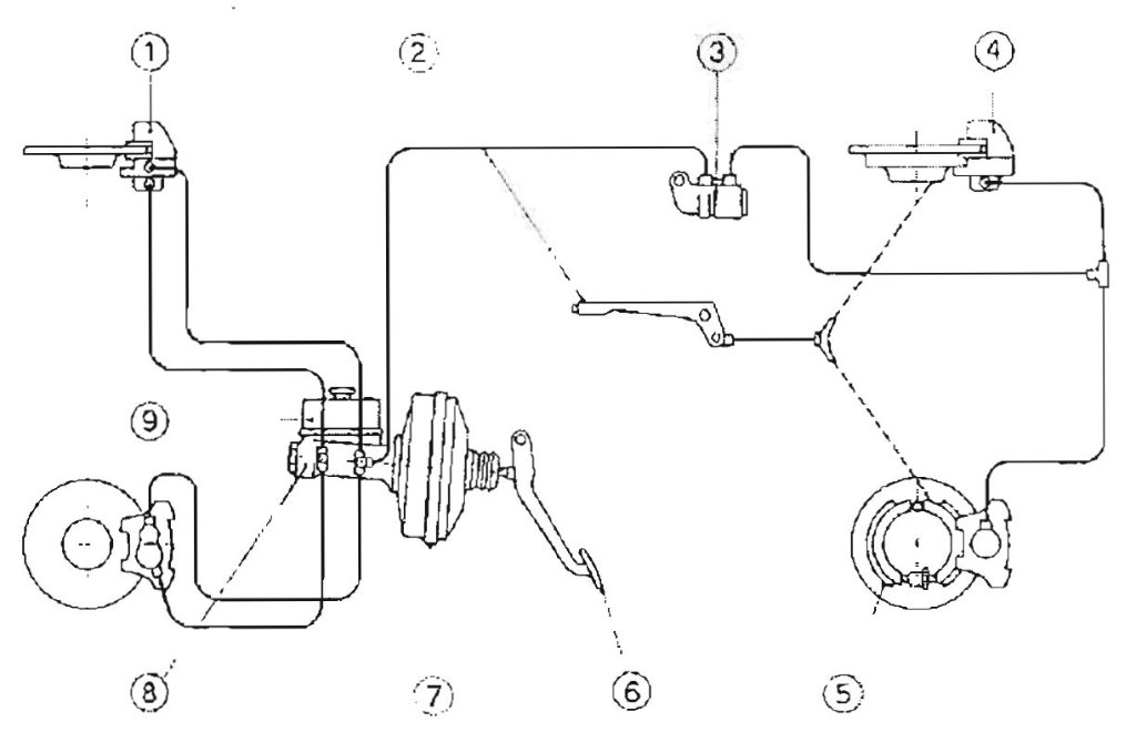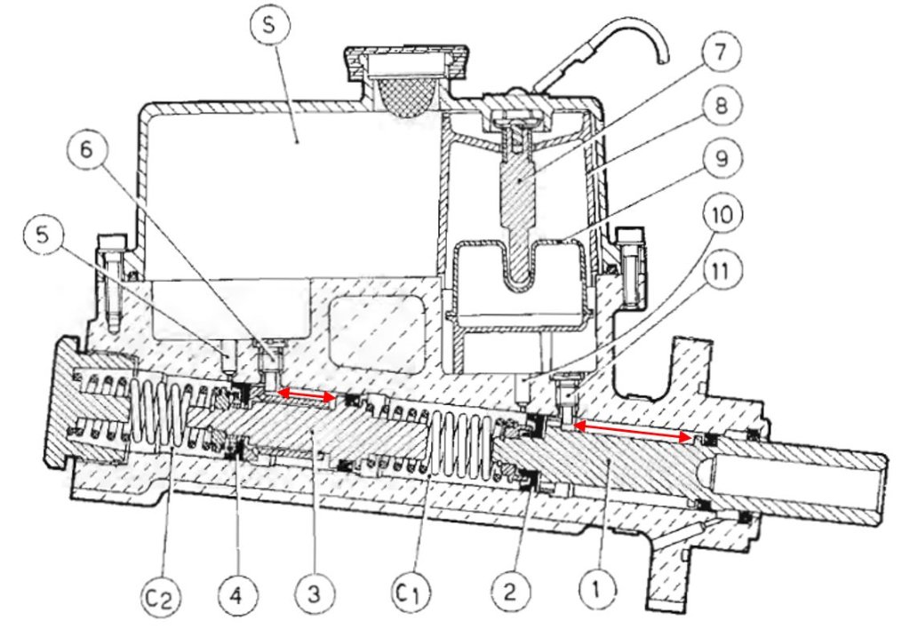 Das Pedal drückt auf den Kolben 1. Kolben 1 drückt Flüssigkeit zu 4 großen Zylindern vorne und zu Kolben 2. Kolben 2 drückt Flüssigkeit zu 4 kleinen Zylindern hinten. Wenn der Kreislauf 1 seine Flüssigkeit verliert, muss der Kolben 1 tiefer gehen und mechanisch gegen den Kolben 2 drücken. Der Kolben 2 muss sich dann so weit bewegen, dass genügend Flüssigkeit nach hinten fließt, damit die hinteren Bremsen funktionieren. Die Länge der Kammern wird so berechnet, dass dies gut funktioniert. Befindet sich der Kreislauf 2 ohne Flüssigkeit, bewegt sich der Kolben 2 bis zum Anschlag, ohne den zur Druckerzeugung in Kammer 1 erforderlichen Gegendruck aufzubauen. Erst wenn der Kolben 2 den Anschlag erreicht hat, baut die Kammer 1 einen ausreichenden Druck für die Vorderradbremsen. Auch hier muss das Pedal viel tiefer gehen (ohne auf den Boden zu gehen!).