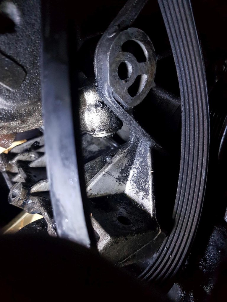 Dann konnte man die Leckage sehen: Da war so eine Verschlusschraube locker, die so eine Feder reindrückt, vermutlich das Bypassventil vom Ölfilter oder eins von der Ölpumpe, die sitzt ja da im rechten Stirndeckel.