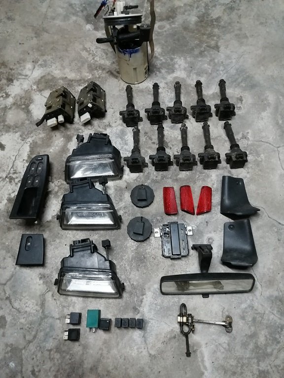 Nebelscheinwerfer, Türschlösser, 10 Zündspulen Bosch, Türreflektoren , Benzinpumpe ( wurde von der Werkstatt gewechselt, war aber nicht die Ursache, funktioniert ) Türfangband , Relais usw