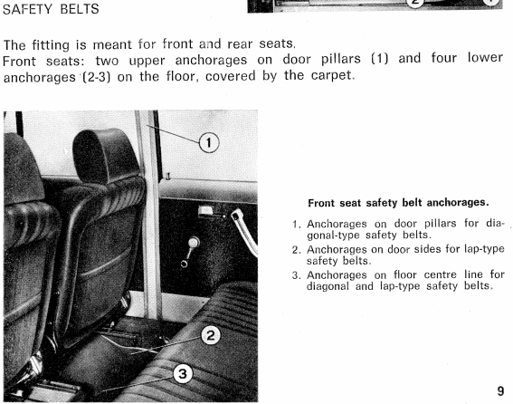 Joint un extrait du manuel de bord (désolé il est en anglais) indiquant les points d'ancrage des ceintures aux places avant. Si mes souvenirs sont exacts, les points 2 et 3 sont sur le plancher, légèrement en retrait du siège avant, à droite et à gauche.