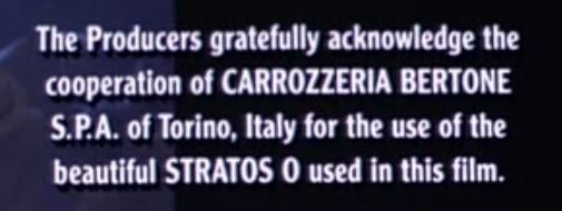Avevo sempre letto e sentito dire che quella usata nel film era una replica della Stratos Zero, ed invece leggo: "The Producers gratefully acknowledge the cooperation of CARROZZERIA BERTONE S.P.A. of Torino, Italy for the use of the beautiful STRATOS 0 used in this film."