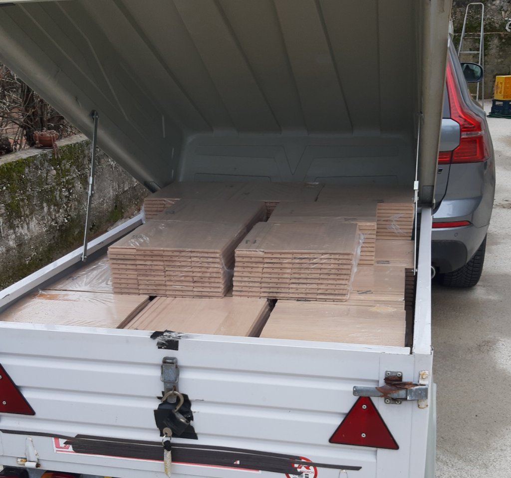 Tutta l'acqua che potevamo prendere l'abbiamo presa specialmente intorno a Firenze. In ogni caso 800km con carrello e auto pieni non sono pochi. Nel carrello, circa un terzo del parquet comprato. La cosa buona è stata lo scarso traffico.