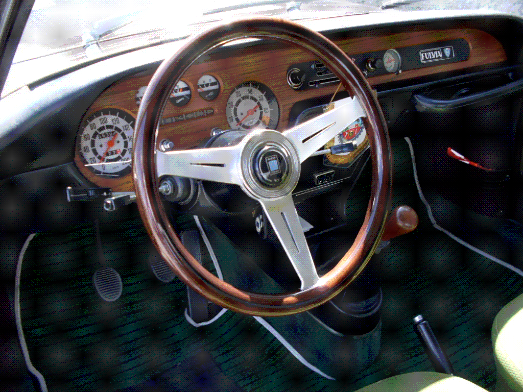 aggiorno il post con qualche nuova immagine della mia fulvia, ho finalmente trovato 5 cerchi Cromodora 6jx14 in ottime condizioni, dopo averli comunque ricondizionati li ho finalmnte montati, la vettura è cambiata totalmente, sia dal punto di vista estetico sia come comportamento su strada, inoltre ho trovato anche a prezzo vantaggiosissimo il volante Nardi con corona in mogano a tonalità scura, non me lo sono fatto sfuggire ed il risultato è visibile nella foto. Preferisco il Ferrero ma ora per un po terrò su il Nardi, facilità la guidabilità per via dell'impugnatura con l'impronta delle dita sul retro e il diametro lievemente maggiore della corona, rispetto al Ferrero.